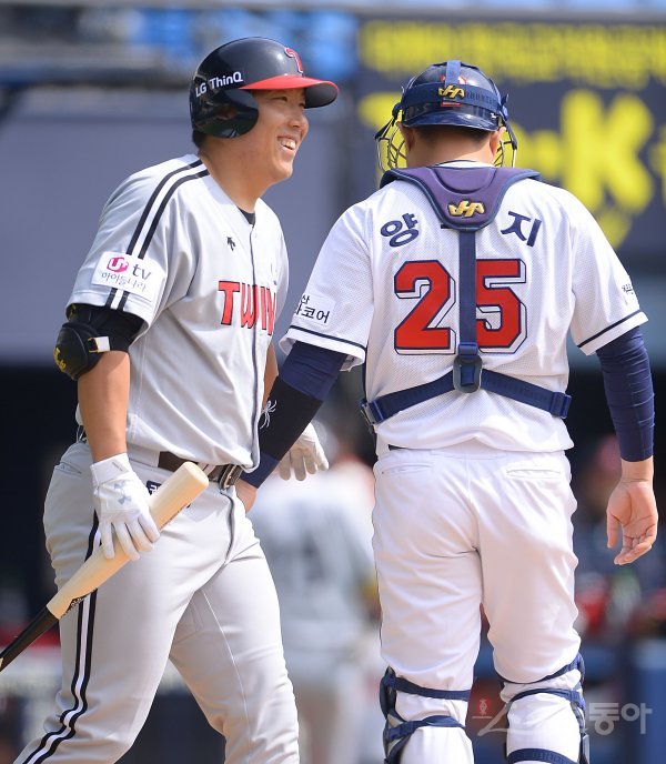 17일 잠실야구장에서 2018 신한은행 마이카 KBO리그 시범경기 두산베어스와 LG트윈스의 경기가 열렸다. 1회초 1사 LG 김현수가 타석에 들어서기 전 두산 포수 양의지와 인사를 나누고 있다.