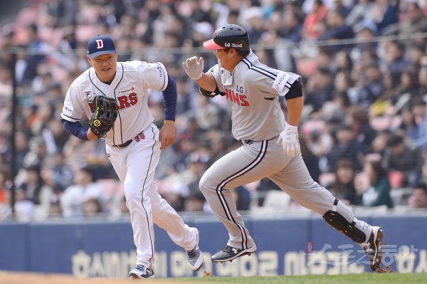 17일 잠실야구장에서 2018 신한은행 마이카 KBO리그 시범경기 두산베어스와 LG트윈스의 경기가 열렸다. 두산 오재일이 3회초 2루타를 치고 나가는 LG 김현수를 바라보며 미소를 짓고 있다.