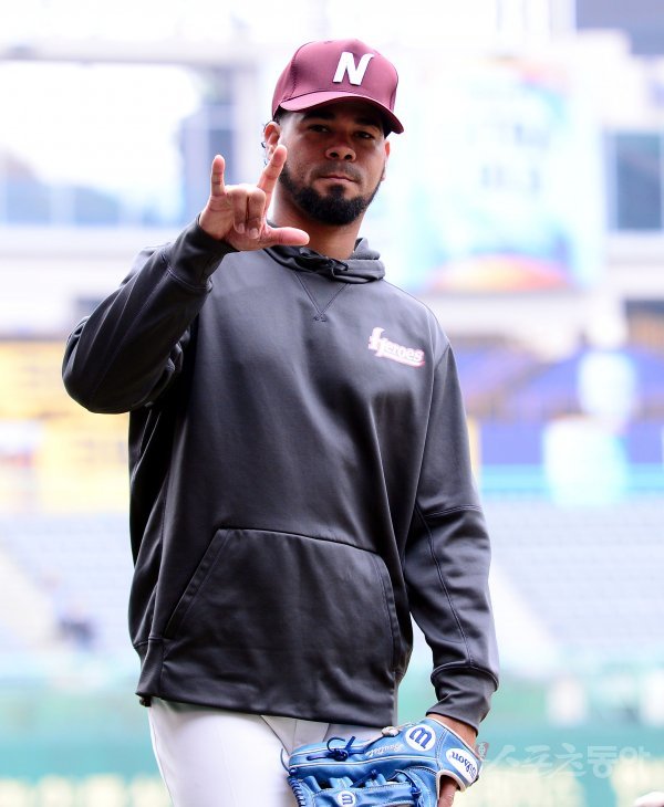 18일 인천 SK행복드림구장에서 ‘2018 신한은행 마이카 KBO리그’ SK 와이번스와 넥센 히어로즈의 시범경가 열린다. 경기 전 넥센 로저스가 카메라를 향해 장난치고 있다.