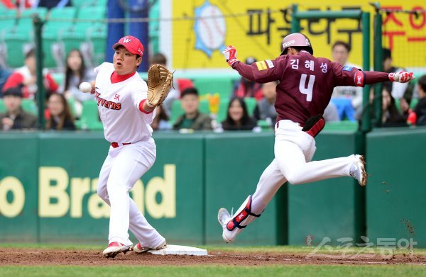 18일 인천 SK행복드림구장에서 ‘2018 신한은행 마이카 KBO리그’ SK 와이번스와 넥센 히어로즈의 시범경가 열렸다. 3회초 2사 3루에서 넥센 김혜성이 내야 땅볼을 치고 난 뒤 1루까지 달리고 있다.