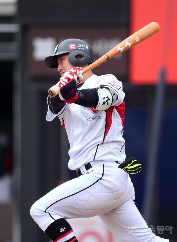 18일 수원kt위즈파크에서 ‘2018 신한은행 MY CAR KBO리그’ 시범경기 롯데자이언츠와 kt위즈의 경기가 열렸다. 3회말 2사 2루 정현이 선제 1타점 적시타를 치고 있다.