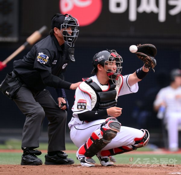 18일 수원kt위즈파크에서 ‘2018 신한은행 MY CAR KBO리그’ 시범경기 롯데자이언츠와 kt위즈의 경기가 열렸다. kt 장성우가 투구된 공을 놓치고 있다.