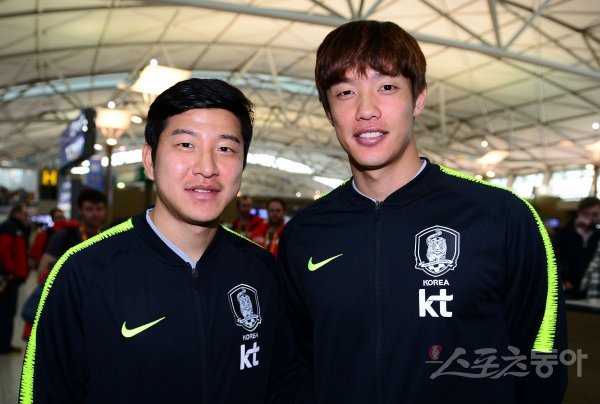 출국에 앞서 축구대표팀 박주호와 홍정호가 카메라를 바라보고 있다.