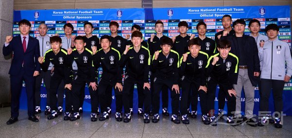 출국에 앞서 축구대표팀 선수 및 코치들이 기념촬영을 하고 있다.