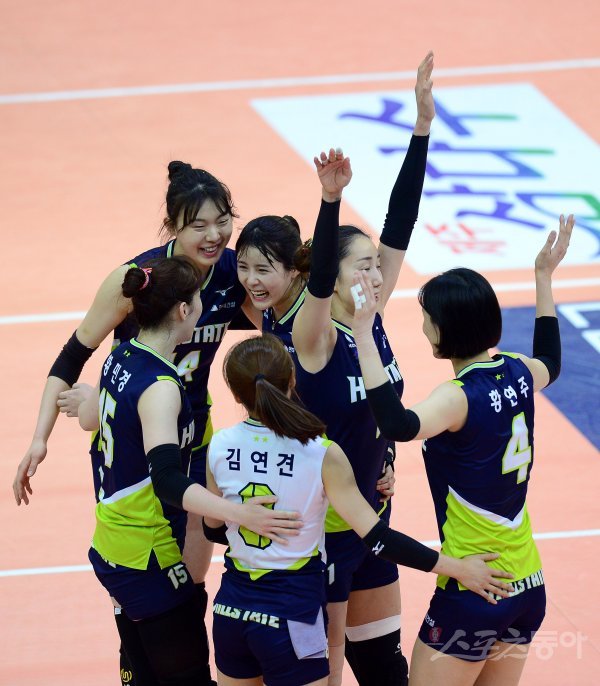 19일 수원실내체육관에서 열린 ‘2017-18 도드람 V리그’ 여자부 플레이오프 2차덩 IBK기업은행와 현대건설 경기에서 현대건설 선수들이 득점에 성공한 후 기뻐하고 있다.