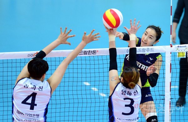 19일 수원실내체육관에서 열린 ‘2017-18 도드람 V리그’ 여자부 플레이오프 2차덩 IBK기업은행와 현대건설 경기에서 현대건설 한유미가 IBK기업은행의 블로킹 사이로 스파이크 공격을 하고 있다.