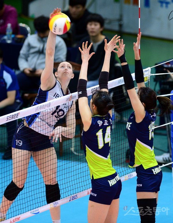 19일 수원실내체육관에서 열린 ‘2017-18 도드람 V리그’ 여자부 플레이오프 2차전 IBK기업은행과 현대건설 경기에서 IBK기업은행 메디가 현대건설의 블로킹 사이로 스파이크 공격을 하고 있다.