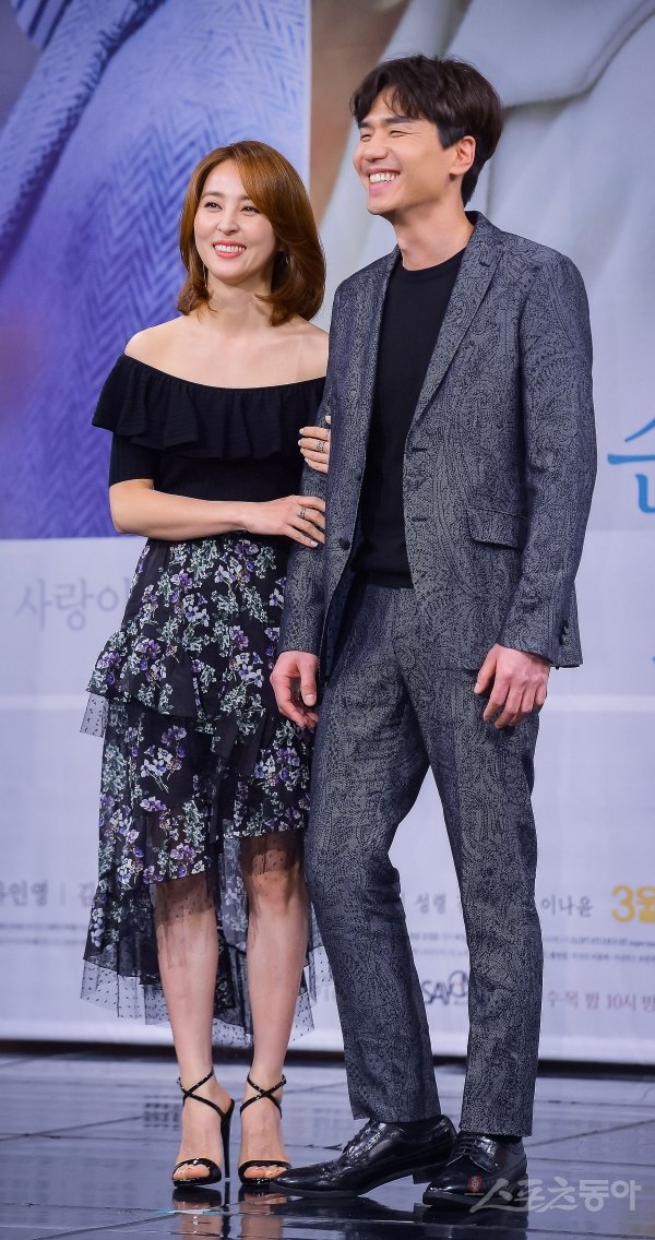 배우 한혜진과 김태훈(오른쪽)이 20일 서울 마포구 상암동 MBC 신사옥에서 열린 MBC 새 수목 미니시리즈 ‘손 꼭 잡고, 지는 석양을 바라보자’ 제작발표회에서 포즈를 취하고 있다.