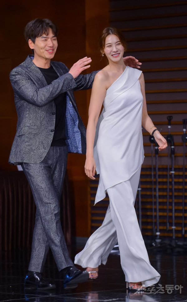 배우 김태훈과 유인영(오른쪽)이 20일 서울 마포구 상암동 MBC 신사옥에서 열린 MBC 새 수목 미니시리즈 ‘손 꼭 잡고, 지는 석양을 바라보자’ 제작발표회에 참석하기 위해 입장하고 있다.
