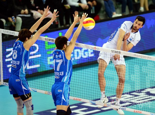 20일 인천 계양체육관에서 ‘2017-2018 도드람 V리그’ 인천 대한항공과 대전 삼성화재의 플레이오프 2차전 경기가 열렸다. 대한항공 가스파리니가 삼성화재 블로커를 피해 스파이크를 날리고 있다.