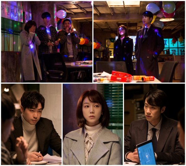 천재인의 아지트에서 촬영된 이 장면은 오랜만에 배우들이 모두 모인 신으로, 촬영 내내 훈훈한 분위기가 이어졌다. 현란한 미러볼 조명 속에서 수다를 이어가던 배우들은 ‘팀 수사 어벤져스’의 회의 촬영이 시작되자 어느 새 날카로운 촉을 간직한 형사와 검사로 완벽히 변신해 집중도 있는 연기를 이어갔다. 특히 마라톤 회의 중에도 머리로 ‘수 싸움’을 이어가는 열연을 펼친 강지환과 심희섭은 “컷” 소리가 나자 다시 ‘형과 아우’로 변하며 특유의 넉살을 드러내, 촬영장에 끊임없는 웃음을 선사했다.