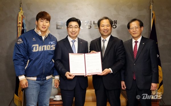 NC와 BNK경남은행은 이러한 내용의 공동 마케팅에 대한 업무협약을 22일 체결했다. 이날 경남 창원시 BNK경남은행 본점에서 협약식을 열고 NC의 간판타자 나성범 선수와 황순현 대표, BNK경남은행 황윤철 은행장 등이 함께했다.