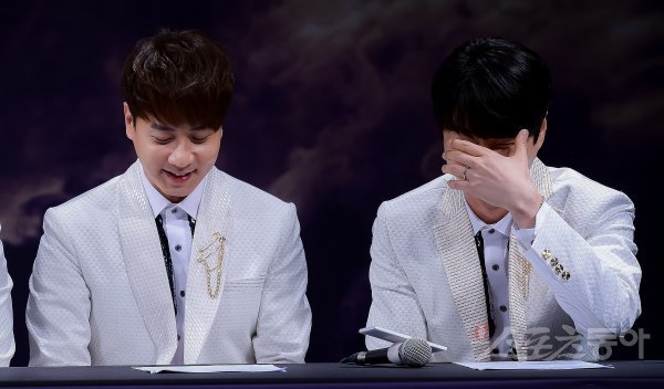 그룹 신화의 앤디와 신혜성(오른쪽)이 25일 서울 송파구 올림픽공원 뮤직라이브홀에서 열린 데뷔 20주년 기념 팬파티 SHINHWA TWENTY FANPARTY ‘ALL YOUR DREAMS’ 개최 기념 기자회견에서 환하게 웃고 있다.