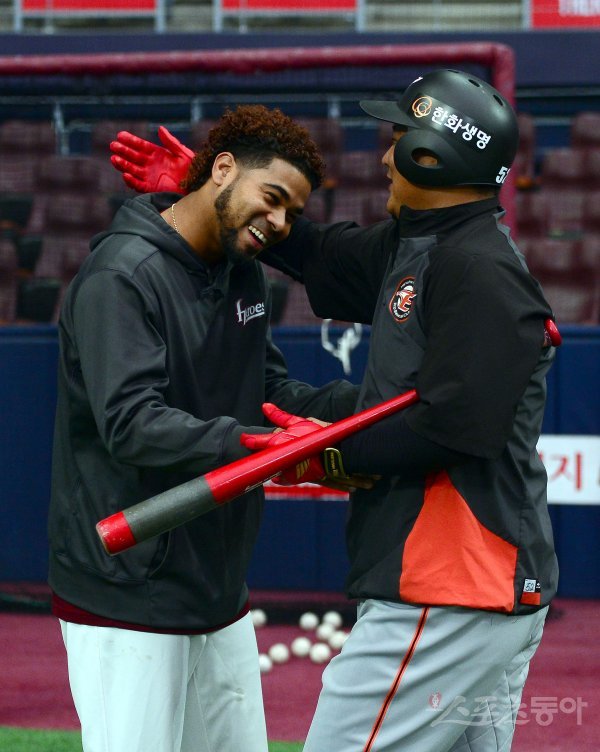 25일 서울 고척스카이돔에서 ‘2018 신한은행 MY CAR KBO리그’ 한화이글스와 넥센히어로즈 경기가 열렸다. 경기 전 넥센 로저스와 한화 김태균이 장난을 치고 있다.