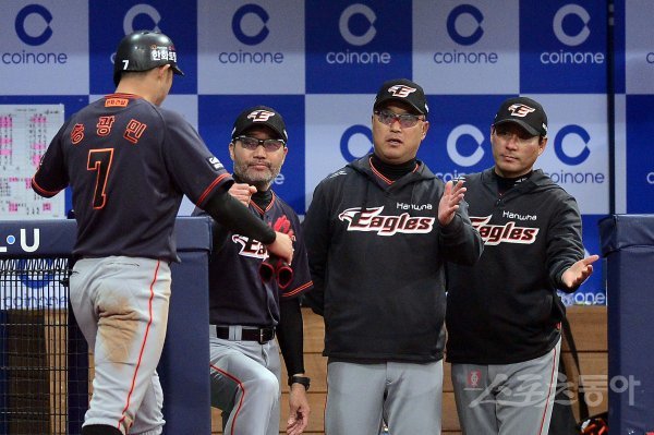 25일 서울 고척스카이돔에서 ‘2018 신한은행 MY CAR KBO리그’ 한화이글스와 넥센히어로즈 경기가 열렸다. 5회초 2사 2루 한화 김태균의 1타점 우전 안타 때 득점한 송광민이 한용덕 감독과 장종훈 코치의 축하를 받고 있다.