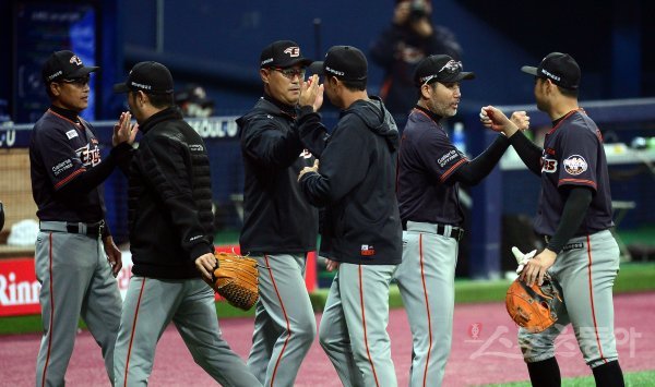 25일 서울 고척스카이돔에서 ‘2018 신한은행 MY CAR KBO리그’ 한화이글스와 넥센히어로즈 경기가 열렸다. 4-1 승리를 거둔 한화 한용덕 감독이선수들과 하이파이브 하고 있다.