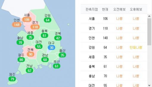 미세먼지는 농도에 따라 ▲좋음(0~30㎍/㎥), ▲보통(31~80㎍/㎥), ▲나쁨(81~150㎍/㎥) ▲매우나쁨(151㎍/㎥~)으로 나뉜다.