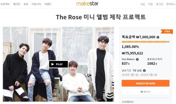 글로벌 크라우드편딩 플랫폼 메이크스타 측에 따르면 26일 밴드 더로즈의 미니앨범 제작 프로젝트가 목표금액 1000%를 돌파하며 현재 1000% 달성률을 기록했다. 이번 프로젝트는 미국과 영국에서 특히 높은 참여율을 보이고 있으며,한국과 일본, 인도네시아, 싱가폴 등 아시아 국가들 그리고 프랑스, 독일, 벨기에, 네덜란드, 스페인, 스위스 등 전세계 60여개 국가의 팬들의 참여로 현재 1020%를 달성했다.
