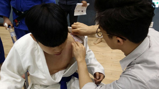 분당자생한방병원 의료진이 지난 24일 열린 제3회 성남시 유도회장기 체급별 유도대회에 참가한 선수를 치료하고 있다.