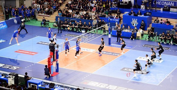 26일 천안 유관순체육관에서 ‘2017-2018 도드람 V리그’ 천안 현대캐피탈과 인천 대한항공의 챔피언 결정전 2차전 경기가 열렸다. 대한항공 가스파리니의 서브 때 4명의 현대캐피탈 선수들이 리시브를 펼치고 있다.