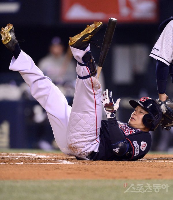 27일 서울 잠실야구장에서 ‘2018 신한은행 MY CAR KBO리그’ 롯데자이언츠와 두산베어스 경기가 열렸다. 6회초 무사 롯데 민병헌이 파울을 치고 중심을 잃어 넘어지고 있다.