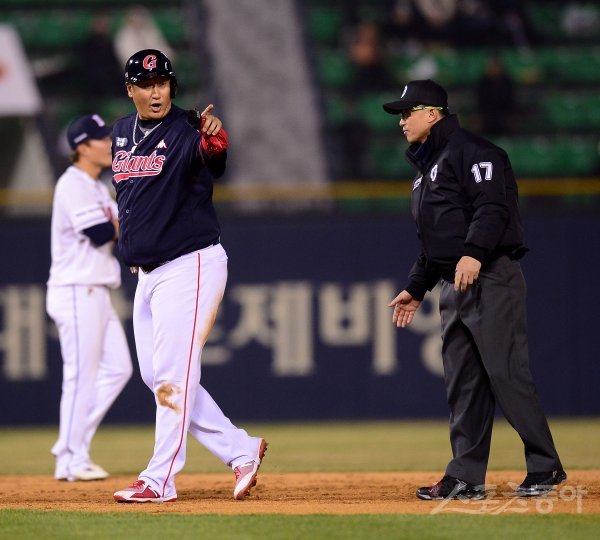 27일 서울 잠실야구장에서 ‘2018 신한은행 MY CAR KBO리그’ 롯데자이언츠와 두산베어스 경기가 열렸다. 4회초 1사 롯데 이대호가 우익수쪽 깊은 타구를 날리고 2루까지 달려 갔으나 1루 베이스를 안밟아 것으로 판정돼 누의 공과로 아웃되자 항의하고 있다.