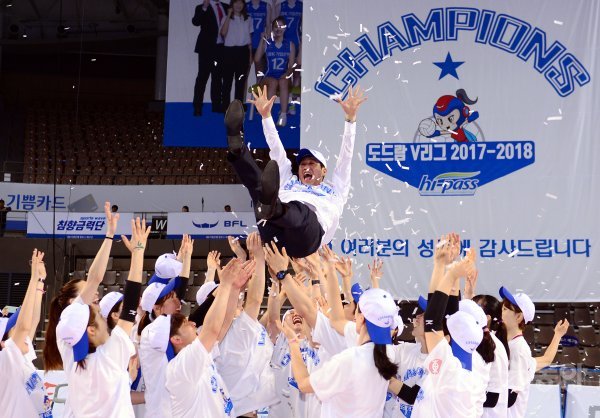 27일 경기도 화성종합실내체육관에서 ‘2017-2018 도드람 V리그’ 화성 IBK기업은행과 김천 도로공사의 챔피언 결정전 3차전 경기가 열렸다. 도로공사가 창단 첫 우승을 달성한 뒤 김종민 감독이 헹가래 세리머니를 펼치고 있다.