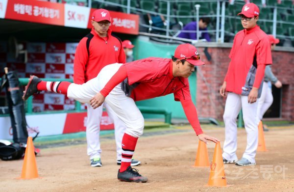 28일 인천 SK행복드림구장에서 ‘2018 신한은행 마이카 KBO리그’ SK 와이번스와 kt 위즈의 경기가 열린다. 경기 전 SK 나주환이 트레이닝 훈련을 하고 있다.