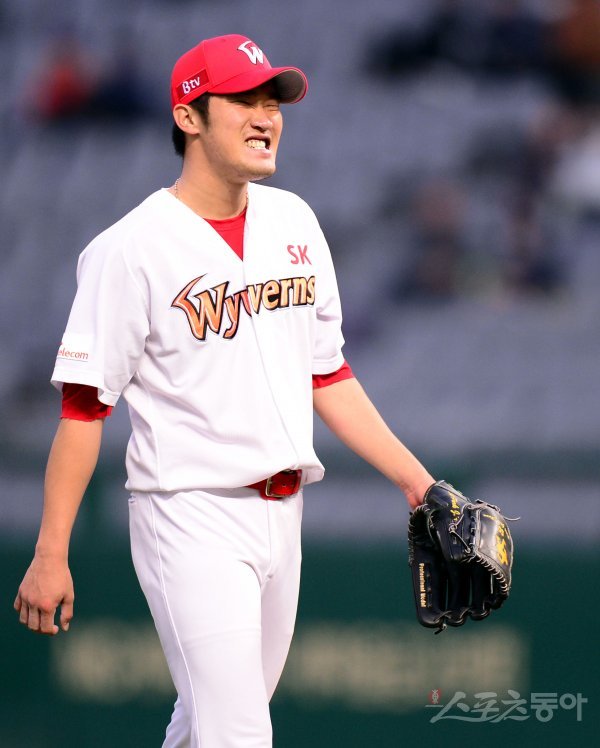 28일 인천 SK행복드림구장에서 ‘2018 신한은행 마이카 KBO리그’ SK 와이번스와 kt 위즈의 경기가 열렸다. SK 선발 투수 박종훈이 1회초 2사 1루에서 kt 황재균 타석 때 1루 주자 로하스의 2루 도루를 저지하려고 이재원이 던진 공에 맞아 고통을 호소하고 있다.