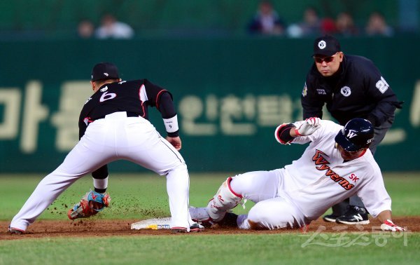 28일 인천 SK행복드림구장에서 ‘2018 신한은행 마이카 KBO리그’ SK 와이번스와 kt 위즈의 경기가 열렸다. 2회말 무사에서 SK 한동민이 2루타를 날린 뒤 슬라이딩 세이프되고 있다.