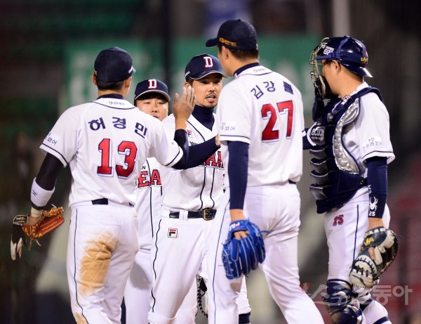 28일 서울 잠실야구장에서 ‘2018 신한은행 MY CAR KBO리그’ 롯데자이언츠와 두산베어스 경기가 열렸다. 6-5 역전승을 거둔 후 두산 선수들이 하이파이브 하고 있다.