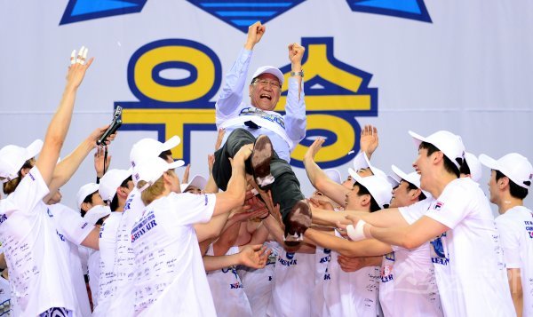30일 인천 계양체육관에서 열린 ‘2017-2018 도드람 V리그’ 인천 대한항공과 천안 현대캐피탈의 챔피언 결정전 4차전 경기에서 대한항공이 현대캐피탈을 꺾고 창단 첫 우승을 달성했다. 대한항공 박기원 감독이 헹가래 세례를 받고 있다.