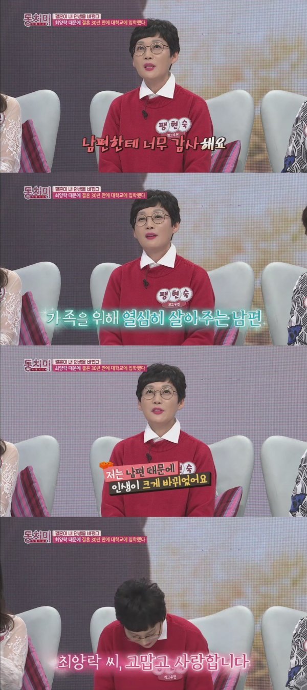 한편, 사업과 방송을 오가며 종횡무진 활발한 활동을 하고 있는 팽현숙은 “작년부터 대학교에 다니고 있다”는 사실을 깜짝 고백하기도 했다. 그녀는 결혼 후 포기했던 공부를 다시 시작하게 된 사연을 밝혀 출연자들로부터 많은 박수갈채를 받았다는 후문. 방송은 31(토) 밤 11시.