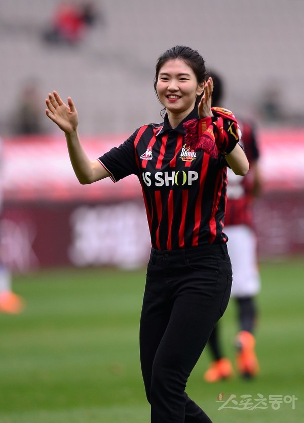 1일 서울월드컵경기장에서 열린 프로축구 ‘2018 KEB 하나은행 K리그1(클래식)’ 인천유나이티드와 FC서울 경기에서 쇼트트택 국가대표 심석희가 시축을 한 후 관중에게 인사하고 있다.