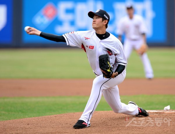 1일 수원 kt위즈파크에서 ‘2018 신한은행 마이카 KBO리그’ kt 위즈와 두산 베어스의 경기가 열렸다. kt 선발투수 고영표가 힘차게 볼을 던지고 있다.