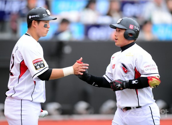 1일 수원 kt위즈파크에서 ‘2018 신한은행 마이카 KBO리그’ kt 위즈와 두산 베어스의 경기가 열렸다. 5회초 무사에서 kt 박경수가 두산 후랭코프를 상대로 좌월 솔로 홈런을 쏘아 올린 뒤 이해창의 환영을 받고 있다.