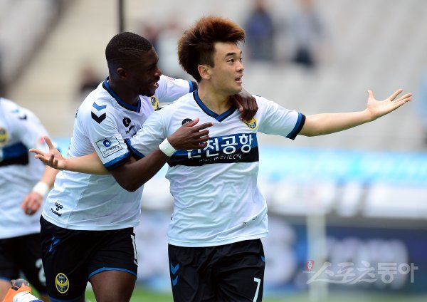 1일 서울월드컵경기장에서 열린 프로축구 ‘2018 KEB 하나은행 K리그1(클래식)’ 인천유나이티드와 FC서울 경기에서 경기 종료 직전 인천 송시우가 동점골을 성공시킨 후 쿠비와 환호하고 있다.