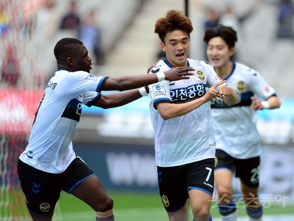 1일 서울월드컵경기장에서 열린 프로축구 ‘2018 KEB 하나은행 K리그1(클래식)’ 인천유나이티드와 FC서울 경기에서 경기 종료 직전 인천 송시우가 동점골을 성공시킨 후 환호하고 있다.