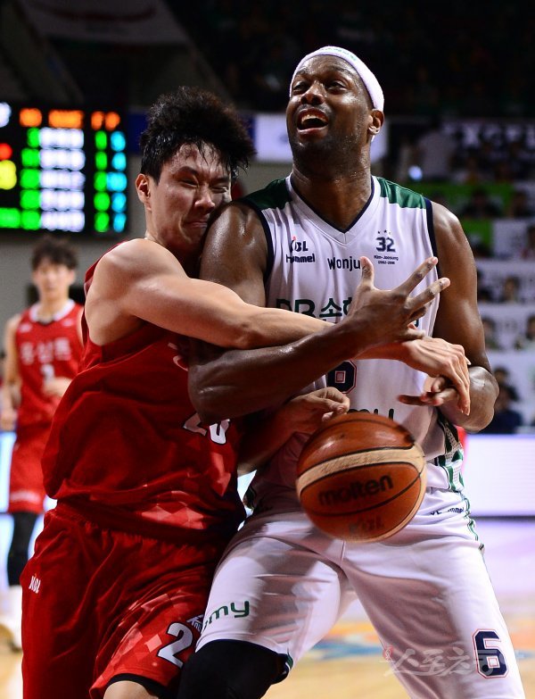 1일 경기도 안양실내체육관에서 열린 ‘2017-2018 정관장 프로농구’ 안양 KGC와 원주 DB의 4강 플레이오프 경기에서 DB 벤슨이 KGC 전성현의 반칙을 얻어내고 있다.