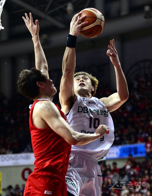 1일 경기도 안양실내체육관에서 열린 ‘2017-2018 정관장 프로농구’ 안양 KGC와 원주 DB의 4강 플레이오프 경기에서 DB 김태홍이 KGC 한희원의 수비를 피해 슛을 쏘고 있다.