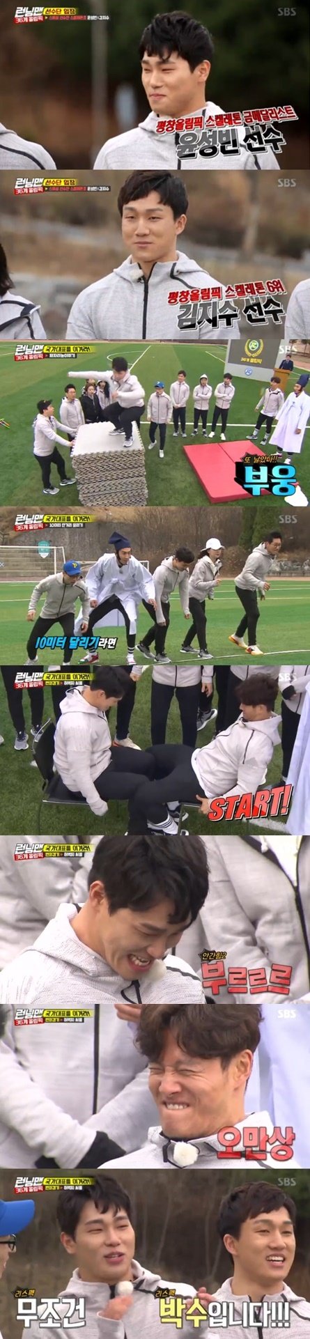 두 선수는 팀을 나눠 펼쳐진 스포츠 게임 대결에서 ‘올림픽 국가대표’다운 특급 운동신경으로 ‘런닝맨’ 멤버들을 제압했다. 윤성빈은 본인이 제안한 제자리 높이뛰기에서 스프링처럼 뛰어오르며 독보적인 실력으로 1위를 거머쥐었다. 아무도 넘지 못한 1m 20cm에 더해 1m 30cm까지 뛰어올랐다.