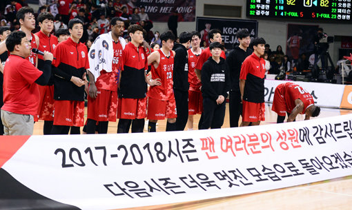 안양 KGC는 1일 안양체육관에서 열린 ‘2017~2018 정관장 프로농구’ 4강 플레이오프(PO·5전3승제) 3차전에서 원주 DB에 92-82로 패했다. 4강 PO 1~3차전을 내리 패한 KGC는 아쉽게 이번 시즌을 마감했다.