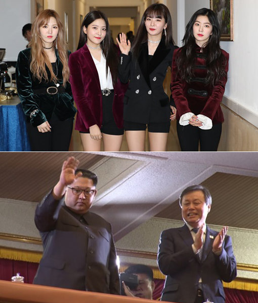 걸그룹 레드벨벳(위쪽)-김정은 북한 노동당 위원장(아래 사진 왼쪽). 사진|평양공연 사진공동취재단