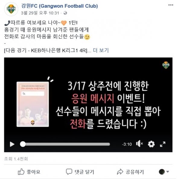 강원FC는 현재 홈 경기장에서 진행되는 크고 작은 이벤트들과 경기 관련 및 선수단 소식 등을 페이스북을 통해 세세히 팬들에게 공개 중이다. 선수들을 대상으로 촬영한 ‘승리의 코멘터리’, ‘퀴즈대결’ 등의 재밌는 기획영상도 매주 업로드하고 있다.