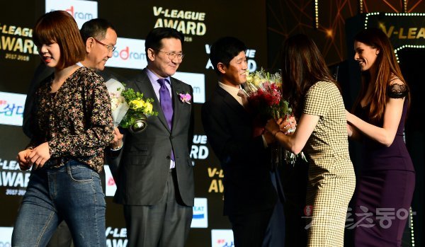 3일 서울 홍은동 그랜드힐튼호텔에서 ‘2017-2018 도드람 V리그’ 시상식이 열렸다. 감독상을 수상한 김종민 감독이 선수들의 축하를 받고 있다.