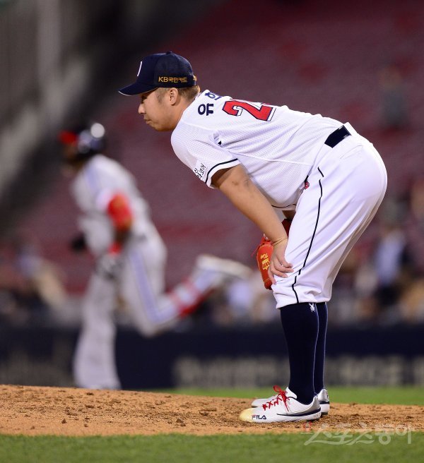 3일 서울 잠실야구장에서 ‘2018 신한은행 MY CAR KBO리그’ LG트윈스와 두산베어스 경기가 열렸다. 선발 투수로 등판한 두산 유희관이 4회초 무사 LG 가르시아에게 좌월 솔로 홈런을 허용한 후 외야를 바라보고 있다.