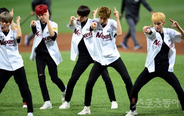 3일 서울 고척스카이돔에서 ‘2018 신한은행 마이카 KBO리그’ 넥센 히어로즈와 kt 위즈의 경기가 열렸다. 남성그룹 업텐션이 클리닝타임 때 축하공연을 선보이고 있다.