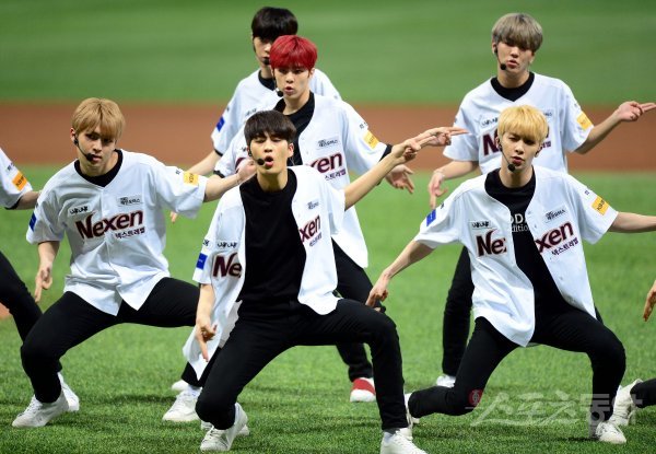 3일 서울 고척스카이돔에서 ‘2018 신한은행 마이카 KBO리그’ 넥센 히어로즈와 kt 위즈의 경기가 열렸다. 남성그룹 업텐션이 클리닝타임 때 축하공연을 선보이고 있다.