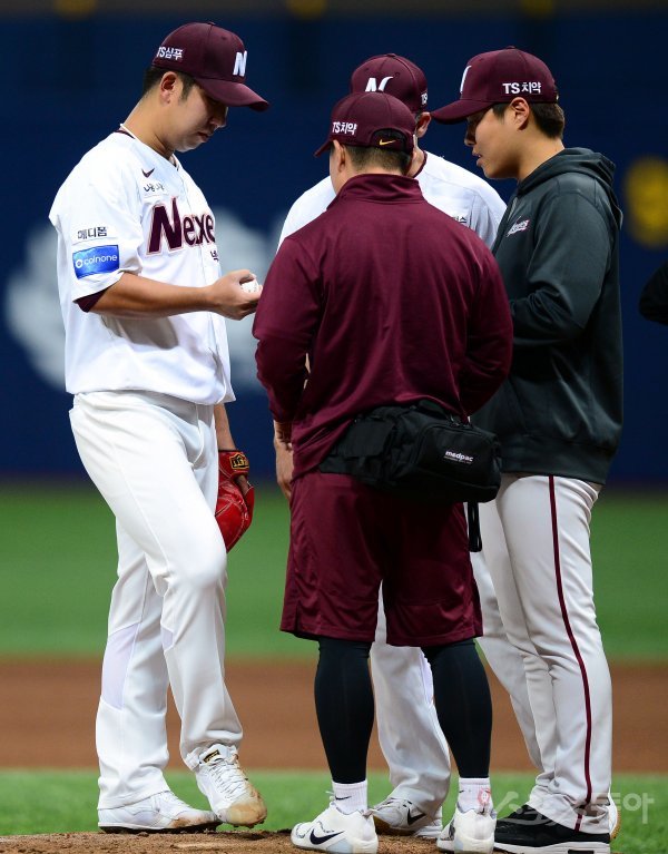 3일 서울 고척스카이돔에서 ‘2018 신한은행 마이카 KBO리그’ 넥센 히어로즈와 kt 위즈의 경기가 열렸다. 5회초 무사에서 넥센 선발 신재영이 부상으로 교체되고 있다.