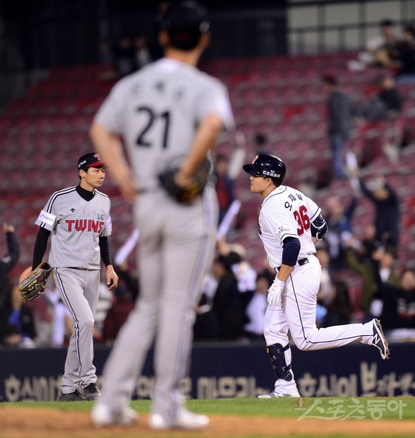 3일 서울 잠실야구장에서 ‘2018 신한은행 MY CAR KBO리그’ LG트윈스와 두산베어스 경기가 열렸다. 8회말 2사 3루 두산 오재일이 우월 투런 홈런을 날린 후 그라운드를 돌고 있다.